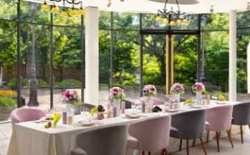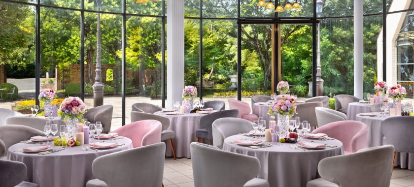 自然あふれる森とガーデンを一望できる、ヨーロッパ×アンティーク風の披露宴会場。