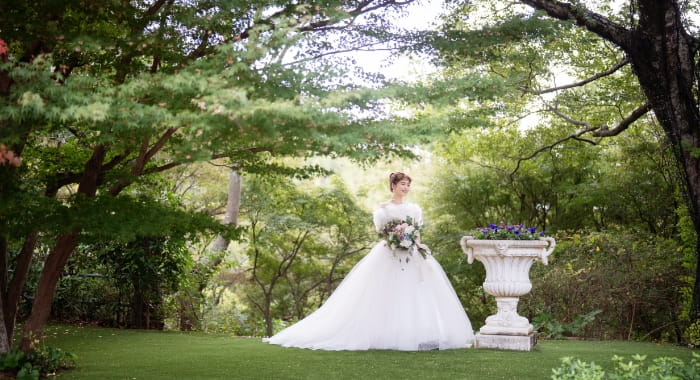 四季折々の表情を見せてくれる、森の中のガーデン。春から夏にかけての新緑や溢れる光、秋から冬にかけての絵画のような紅葉の美しさが、おふたりの特別な一日に彩りを添えます。写真撮影にも抜群のロケーション。